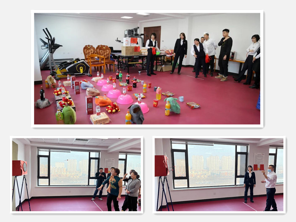 套圈活動現(xiàn)場,福字、春聯(lián)、飲料、保溫杯、抱枕、餐具套裝等等,還有價值2000元的紅酒,隨著一聲聲歡呼,參加活動的同事滿臉笑容的一堆堆套走。飛鏢靶前,屏氣凝神,大家為投手吶喊助威。