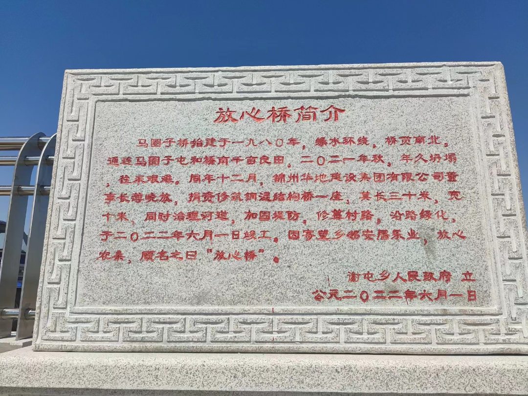 錦州華地建設(shè)集團(tuán)董事長薄曉放,得知了這一消息后,非常惦念家鄉(xiāng)父老,立即決定捐建一座橋,以解決家鄉(xiāng)人們出行難的問題。因寄望鄉(xiāng)鄰安居樂業(yè),放心農(nóng)桑,故取名放心橋。