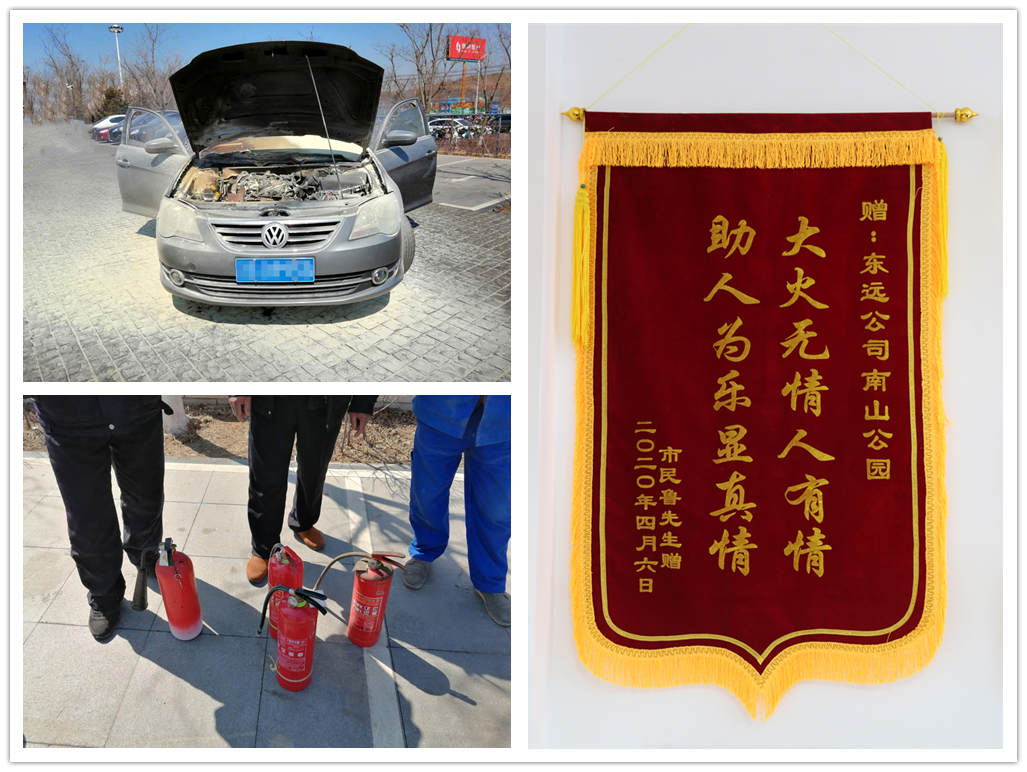 如果說陪伴是最長情的告白,那么“守護平安”則是景區(qū)保安隊員最恒久的承諾。當?shù)谝粫r間發(fā)現(xiàn)停車場內(nèi)游客停放的車有煙冒出時,我們的保安隊員一邊打119報警,一邊迅速拿起滅火器跑到事發(fā)車輛前,不畏竄起的火苗在119到達之前將其撲滅。當游客得知情況匆匆忙忙跑下山看到眼前的一幕,緊緊的拉住保安隊員們的手連聲道著感謝,如果沒有及時給予處理不僅僅是自己車輛造成更嚴重的損失,也會給這滿山都是草木的南山公園造成不可估量的后果。事后游客送來錦旗表達感激之情。