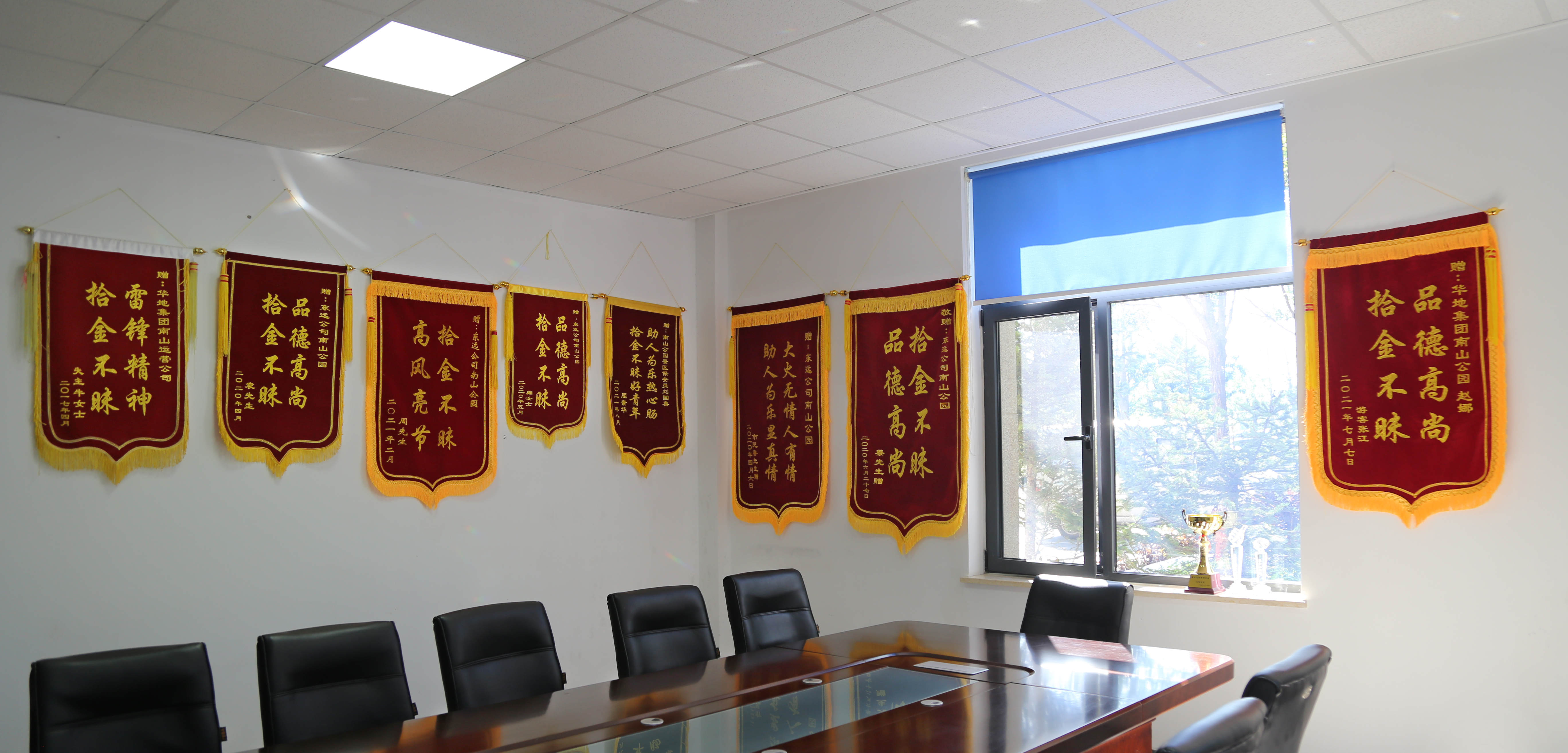 遺失物品登記本上登記著無數(shù)條記錄,身份證、鑰匙、包、手機、錢等等。那里也記錄了我們所有工作人員365天堅守崗位的執(zhí)著與延續(xù)的雷鋒精神。在那會議室墻面上掛著的一面面錦旗承載了市民對于我們?nèi)A地集團東遠人的一份感恩、一份贊許、一份鼓勵。他們用實際行動踐行了作為南山公園守護者的責任與擔當。